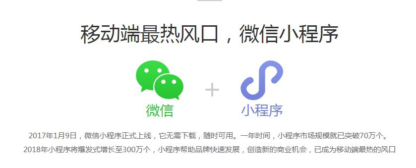 2017年1月9日,微信小程序正式上线,它无需下载,随时可用。一年时间,小程序市场规模就已突破70万个。2018年小程序将爆发式增长至300万个,小程序帮助品牌快速发展,创造新的商业机会,已成为移动端最热的风口。