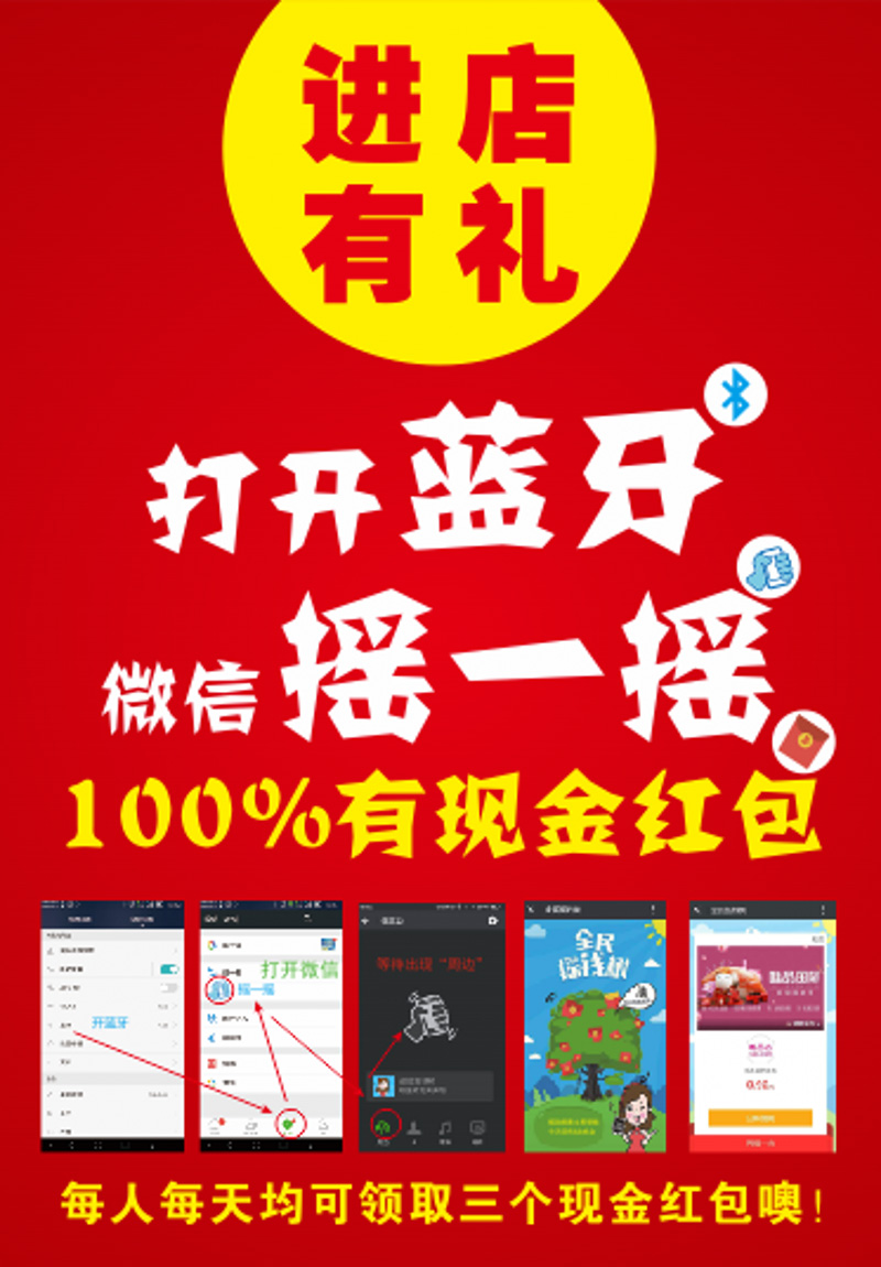 摇钱妹(摇钱盒)一款微型的微信摇一摇周边信号发射设备,当用户进入到设备的覆盖区域范围内,打开蓝牙微信摇一摇便可以领取由平台发放的现金红包。商家通过这种互动性极强的新型营销方式,可以极大的活跃现场活动气氛和店铺的到店频次。摇到的红包资金来